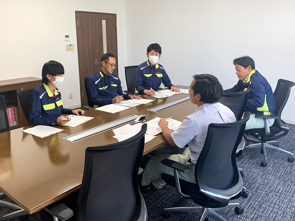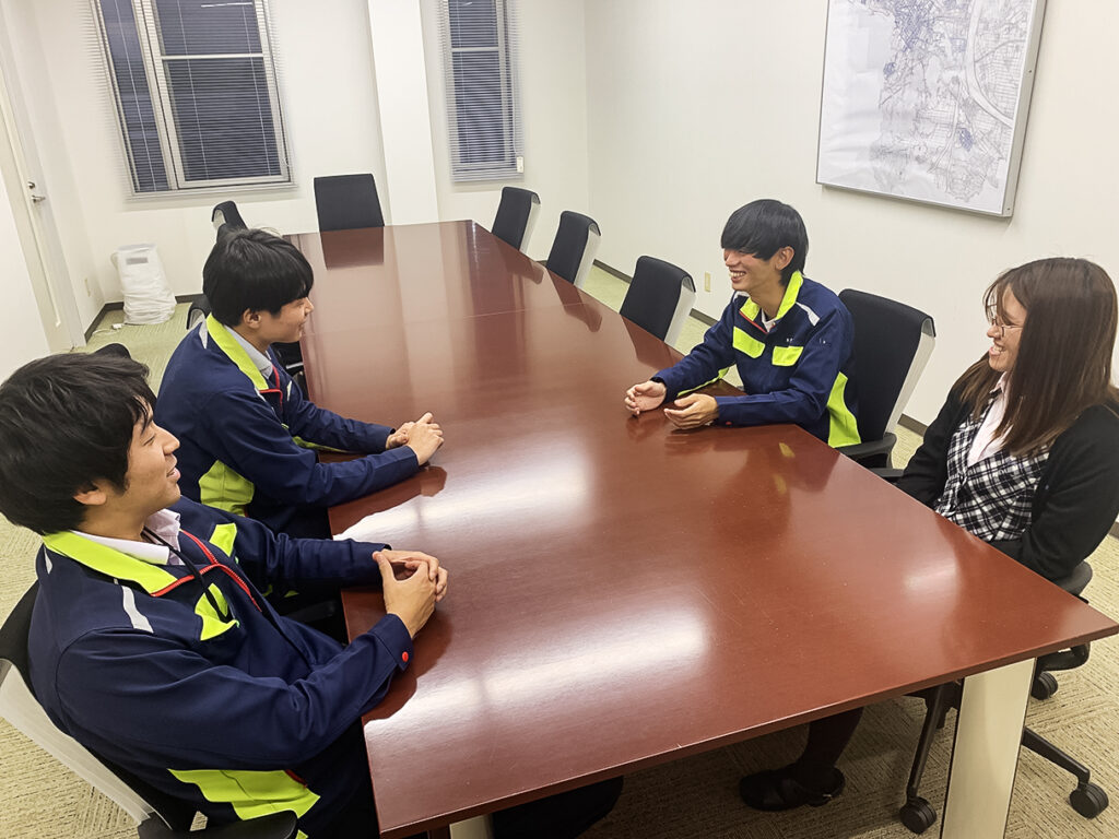 出社後、まずは全体朝礼で連絡事項と朝礼当番から一言をいただきます。次に、各部署に分かれて朝礼を行い、その日の業務について共有し合い、1日が始まります。その後は、現場に向かい11時頃まで上水道等の工事立会い・監視・指示などを行い、終わり次第会社に戻り、現場についての事務作業を進め上司に報告します。